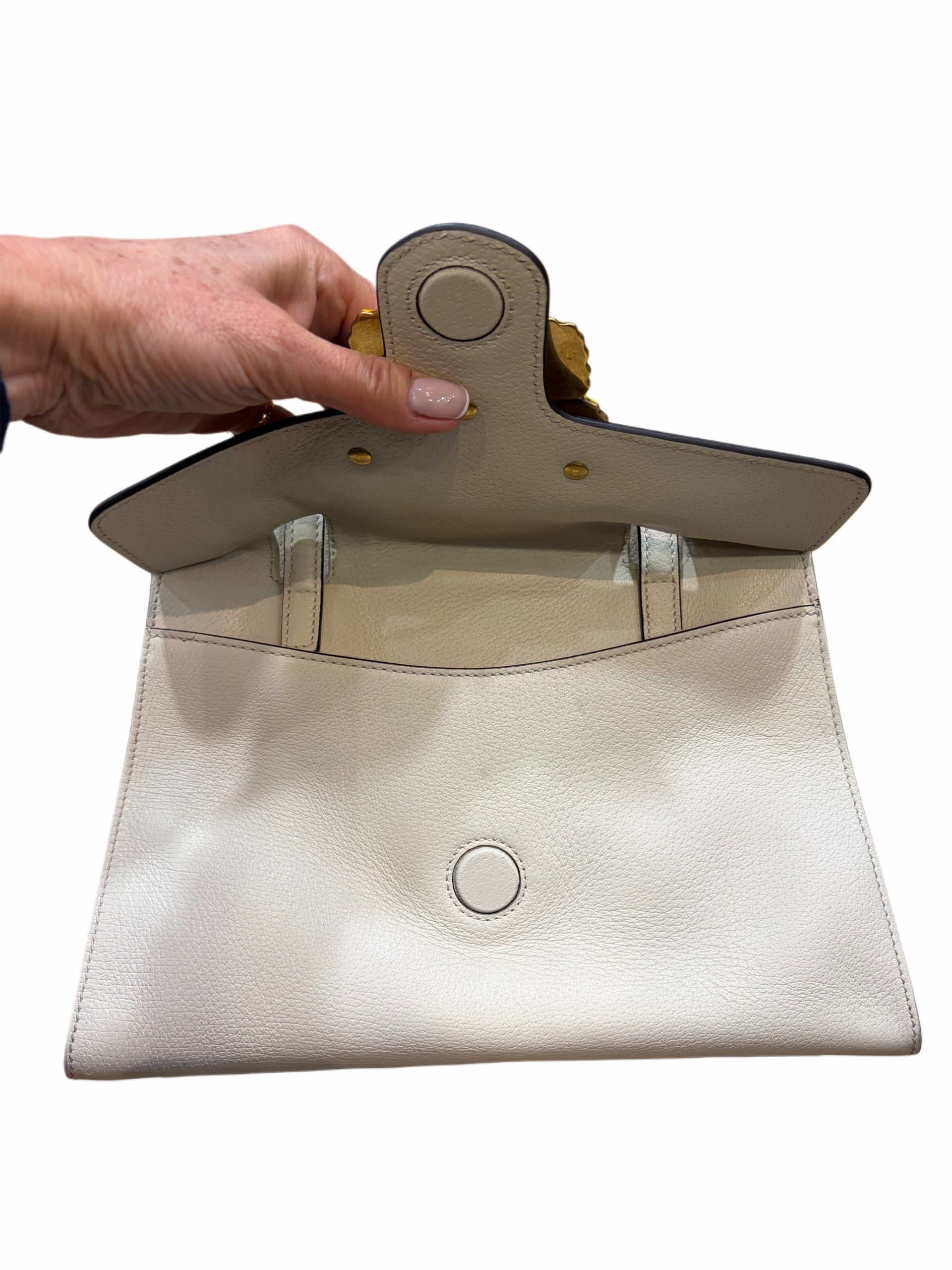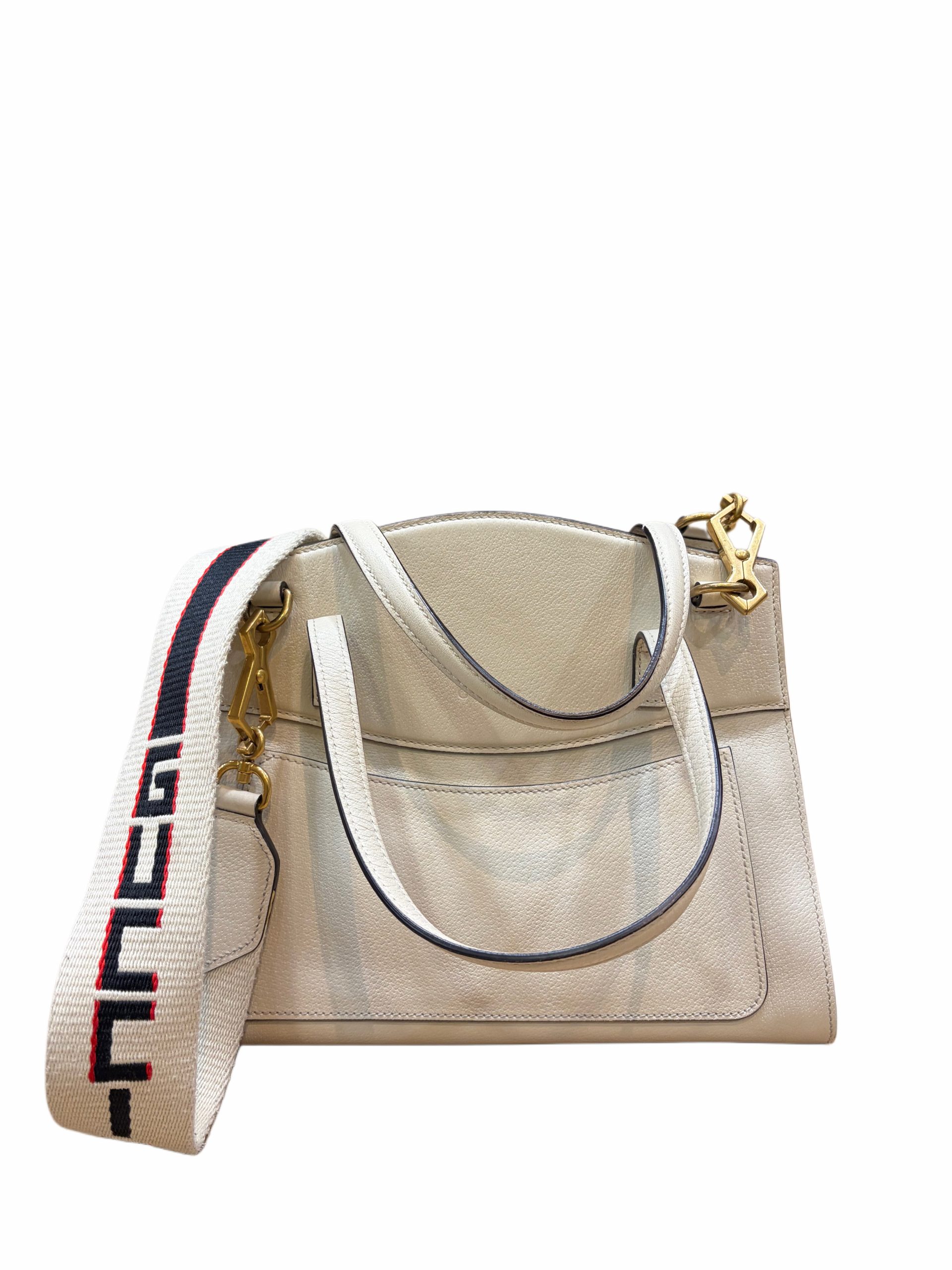 Sac Totem médium Gucci Cuir beige clair 2 anses pour porte main et une bandoulière pour un porté crossbody Dim 30x25x12 cm Très bon état Vendu avec carte d’authenticité et dust bag